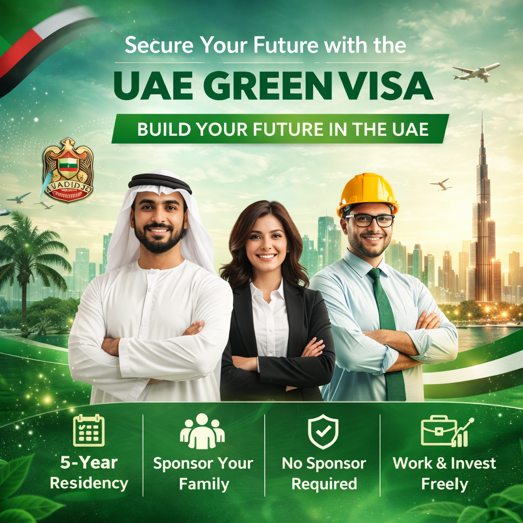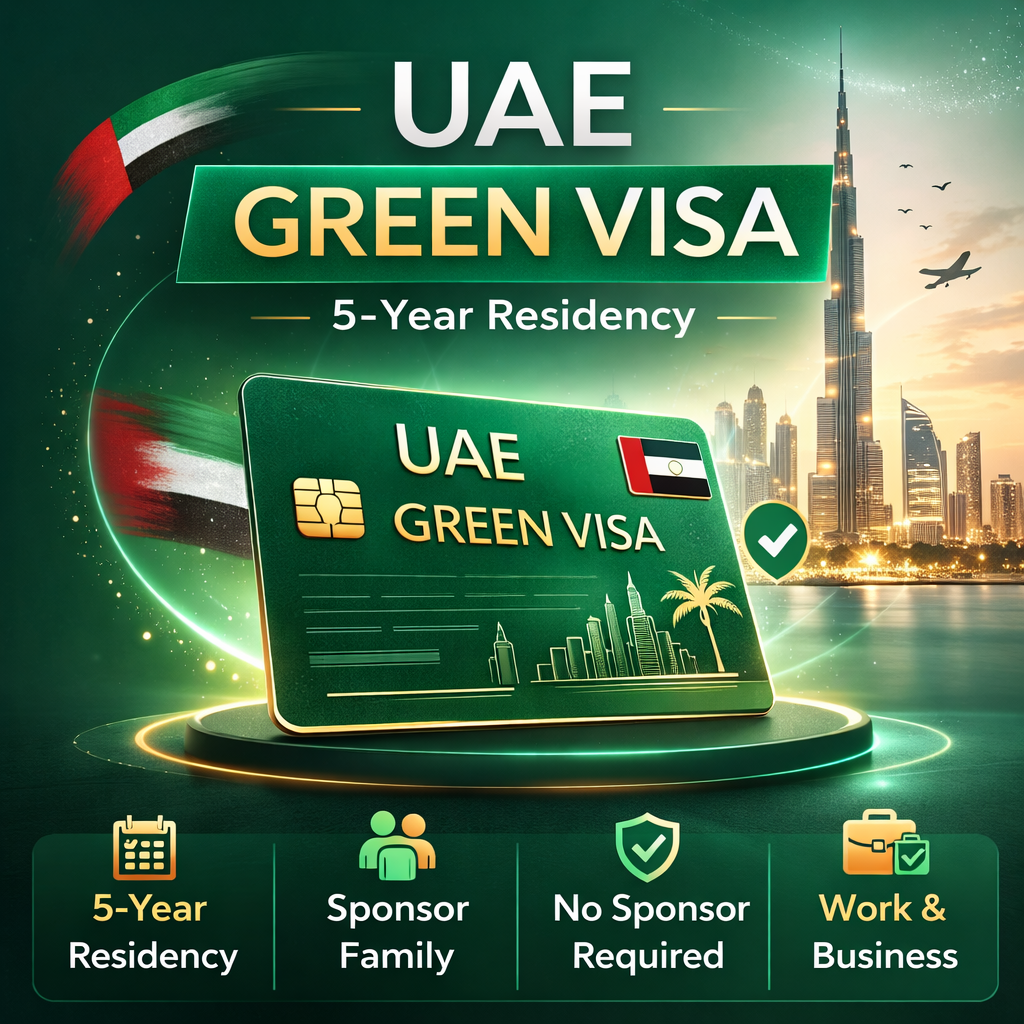 The UAE Green Visa is a 5-year residency visa designed for skilled employees, freelancers, self-employed professionals, investors, and business partners. It offers greater independence by removing the need for employer or sponsor dependency in eligible cases.